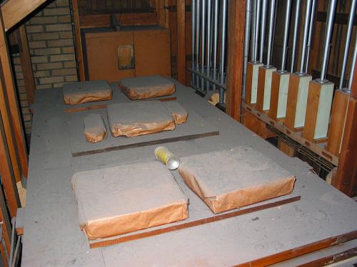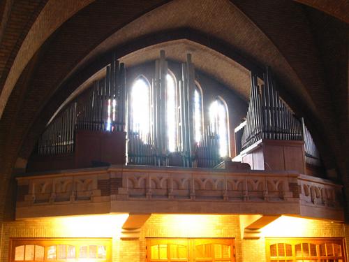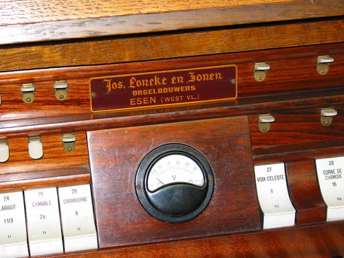 Au-dessus du cadran de voltage, au centre, plaque métallique clouée indiquant : Jos. Loncke en Zonen / orgelbouwers / ESEN (WEST VL.)