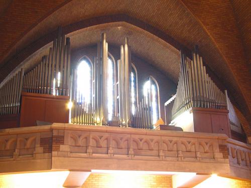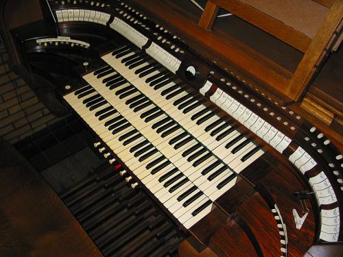 Séparée et perpendiculaire à la balustrade devant le meuble de droite. Meuble simple en chêne avec un grand panneau amovible à l'arrière pour accéder à l'intérieur, volet à lattes en bois coulissant sur les claviers. Intérieur de la console en amphithéâtre avec gradins arrondis de part et d'autre des claviers. En bois exotique de type palissandre, acajou ou africain.