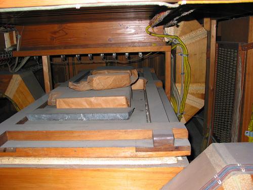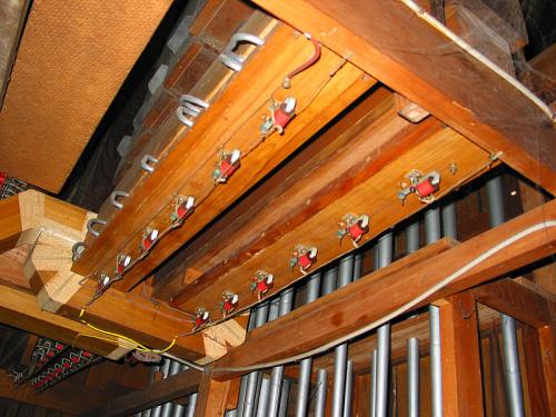 A droite des claviers, à même hauteur, une rangée de languettes pour les annulateurs des jeux à anches et du Trémolo (inexistant!).