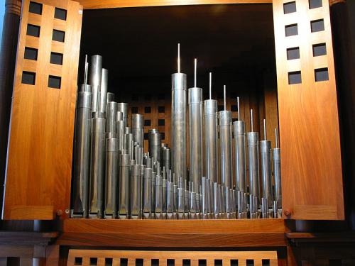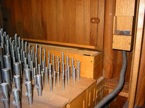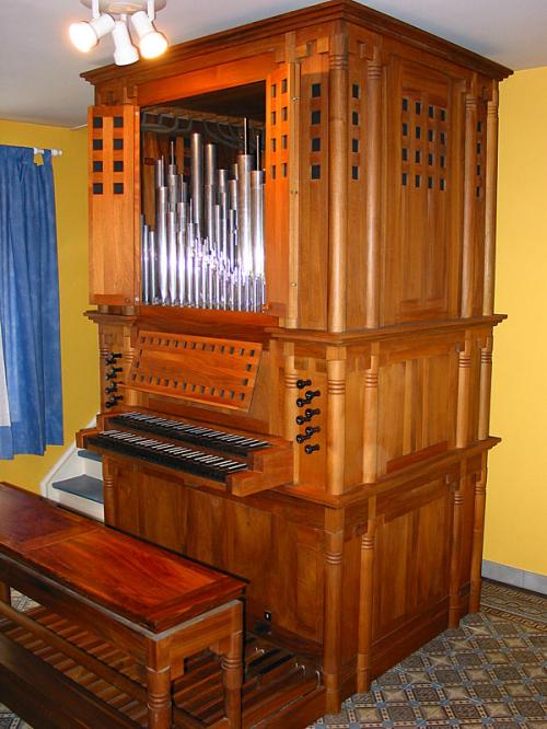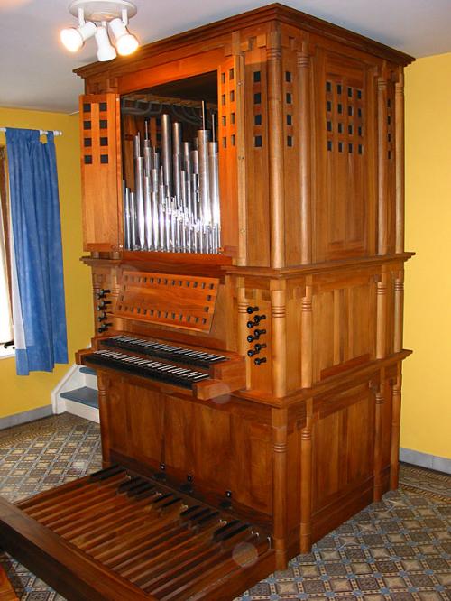 Description du buffet Parallélépipède divisé en hauteur par deux corniches plus une troisième qui couronne l’ouvrage. Aux quatre angles ressortent trois colonnes. Il est à noter que les quatre faces de l’orgue sont de même facture, l’ensemble étant en noyer verni de manière incolore. Tous les panneaux supérieurs sont munis de fausses claires-voies faites de carrés dont le fond est en toile noire colée sur du bois. Il y a diverses moulures à toutes les hauteurs du meuble et tous les assemblages sont invisibles, comme les charnières. Au-dessus des claviers, il y a deux portes articulées qui laissent apparaître la tuyauterie.