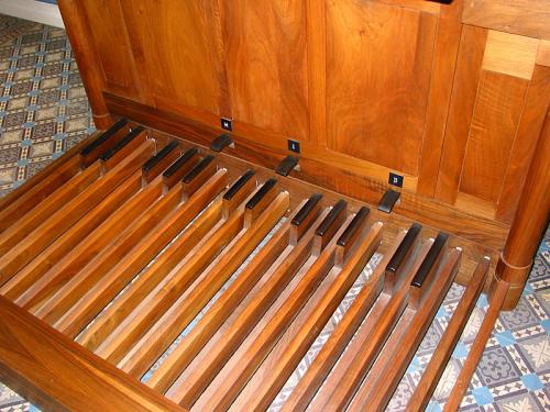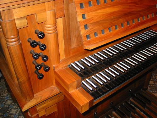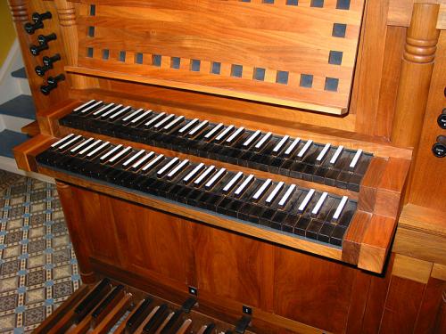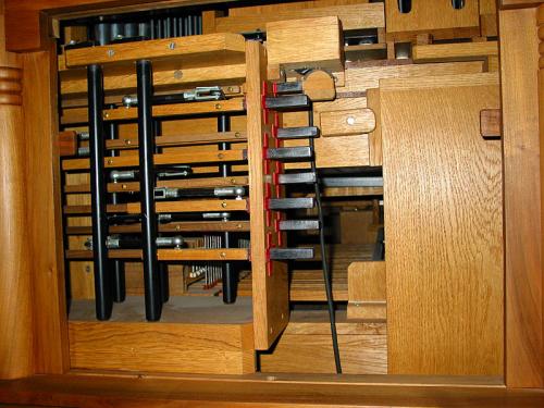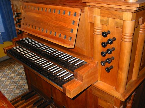 Console - Description En fenêtre sous la façade. Les bras des claviers, en noyer, ressortent du meuble sont doublés par les joues réalisées dans un autre bois de fruitier.