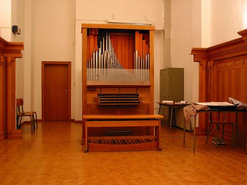 Historique L'instrument Schyven/Stevens de la petite salle d'orgue ayant été vendu et le nouvel instrument étant bloqué dans sa destination finale par les responsables de l'époque, le Conservatoire a, dans un premier temps, loué un orgue d'étude à Etienne Debaisieux. Ensuite, un instrument a été commandé à Westenfelder sur le modèle de celui en possession de Jean Ferrard.