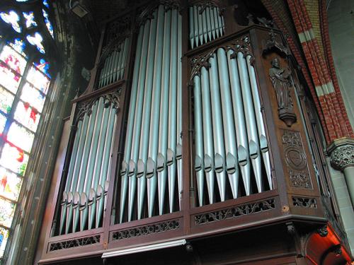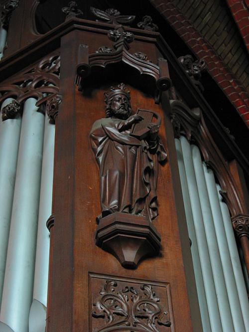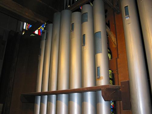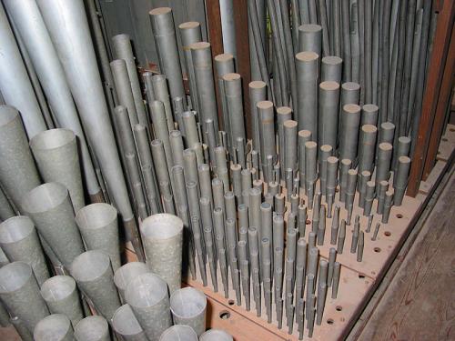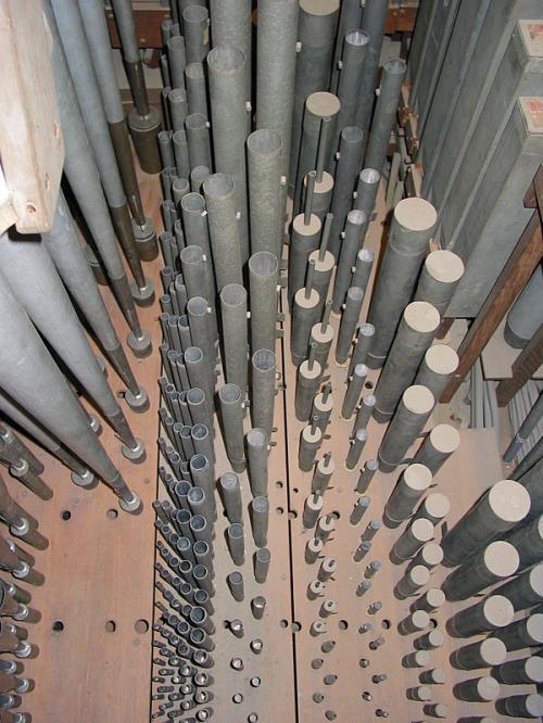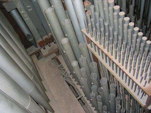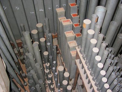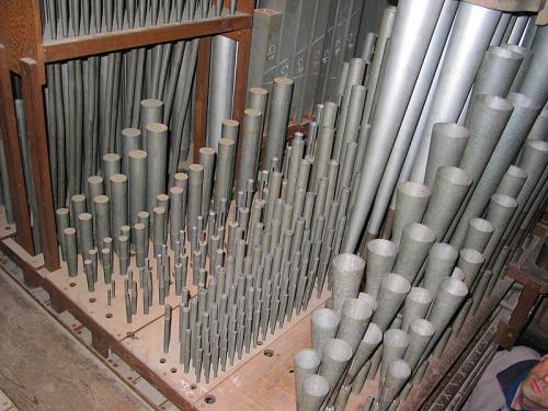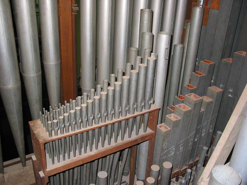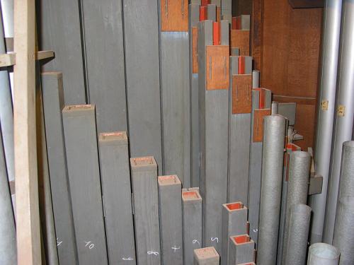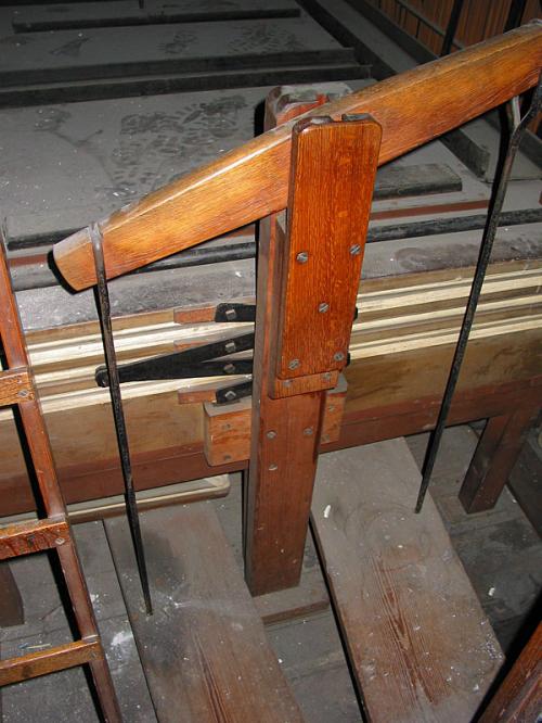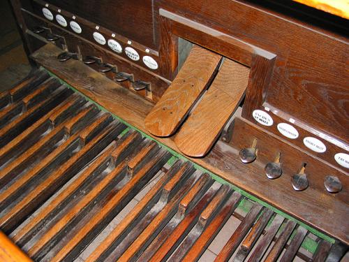 Orgue / Tirasse Positif / Tirasse Récit. Les accouplements Positif au Grand-Orgue / Récit au Grand-Orgue / Octave grave Récit au Grand-Orgue. Deux pédales à bascules pour l'Expression du Positif et l'Expression du Récit. Quatre pédales en fer à cran pour les Appel anches Grand-Orgue / Appel anches Positif / Appel anches Récit / Tremolo au Récit.