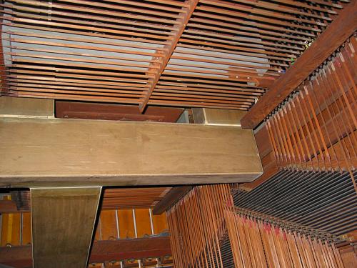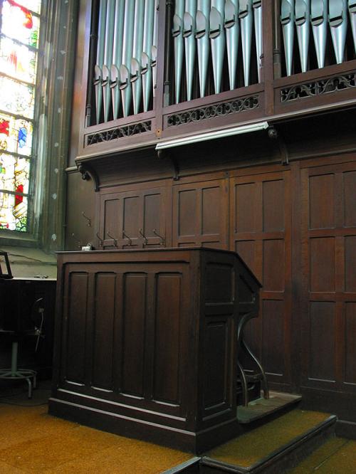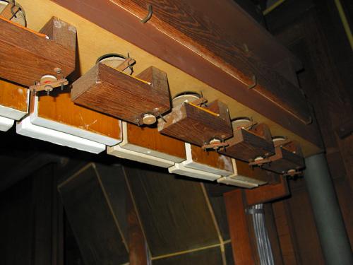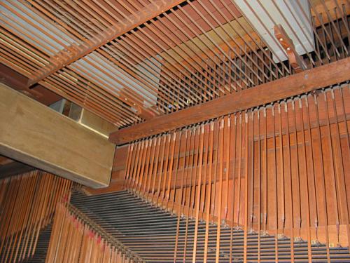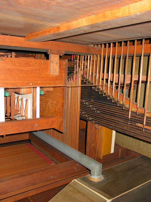 Les tirants de registre sont disposés sur deux niveaux de gradins horizontaux de part et d’autre des claviers (pour Pédale, Grand-Orgue et Positif), ainsi qu’au-dessus du troisième clavier (pour Récit et combinaisons).