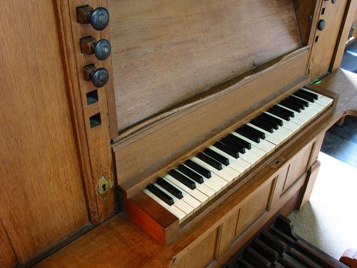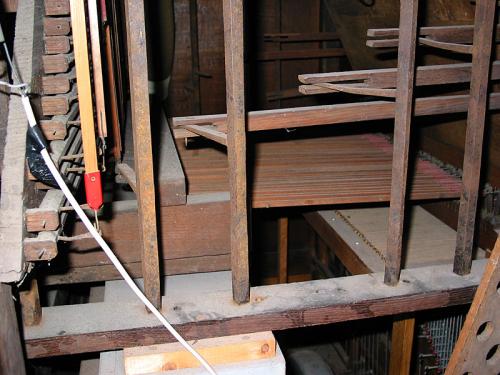 Deux panneaux grossiers et superposés fermaient le soubassement en dessous du clavier. Il s’y trouvait une grande encoche verticale, comme pour recevoir une pédale pour le pied droit, sans doute pour actionner une pompe permettant le jeu de l’orgue sans l’aide d’un souffleur.