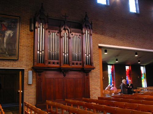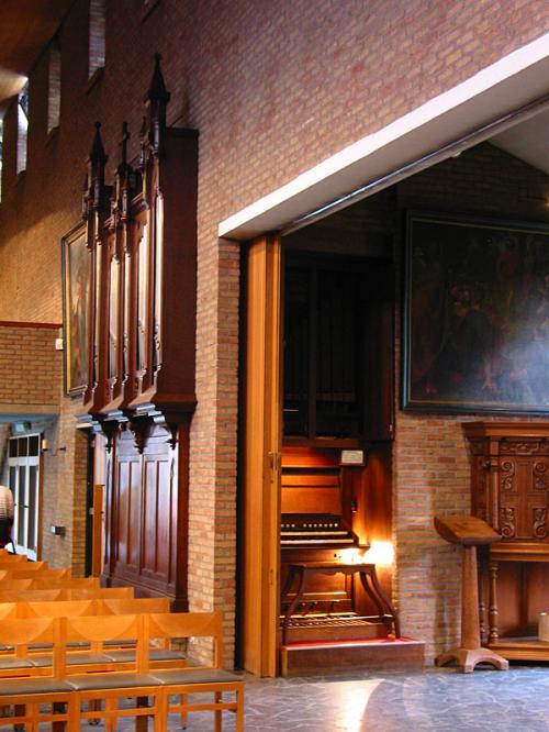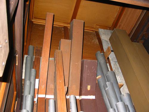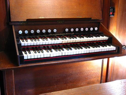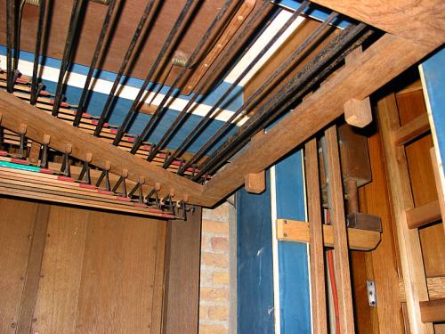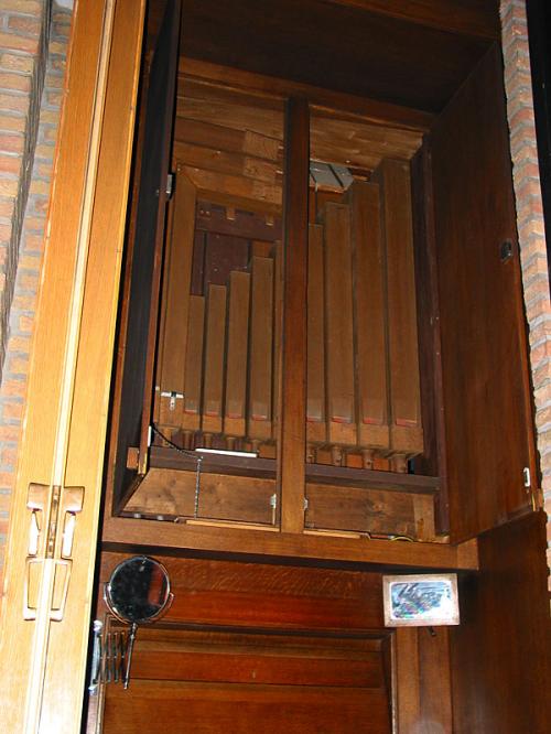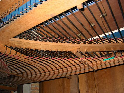 Les deux claviers ressortent de la fenêtre et sont encadrés par deux planches au sommet incliné sur lequel repose le couvercle. Une fois relevé, celui-ci sert de pupitre avec une planchette rabattable pour poser les partitions. Le tout est en chêne.