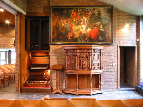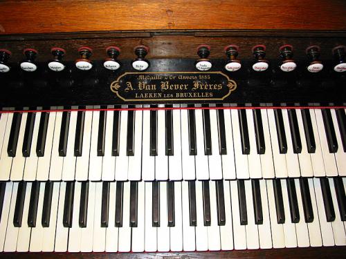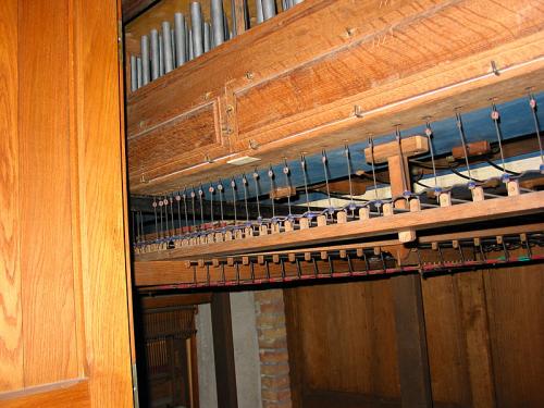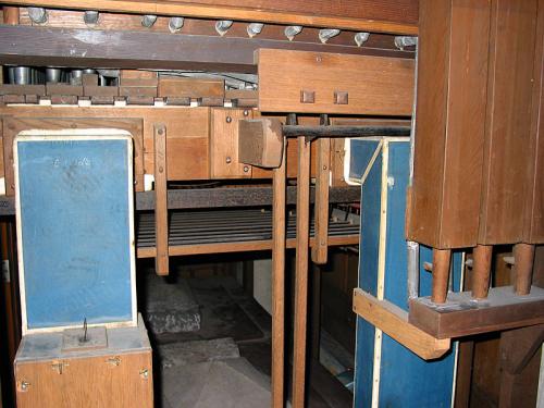 De gauche à droite, il y a l’accouplement du Positif au Grand-Orgue ; l’appel collectif du Prestant, de l’Octavin et de la Trompette du Grand-Orgue ; le renvoi des mêmes jeux ; le Trémolo du Positif et enfin la cuiller d’expression un peu plus grande que les autres.