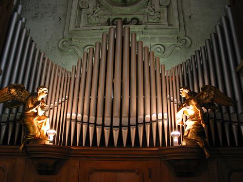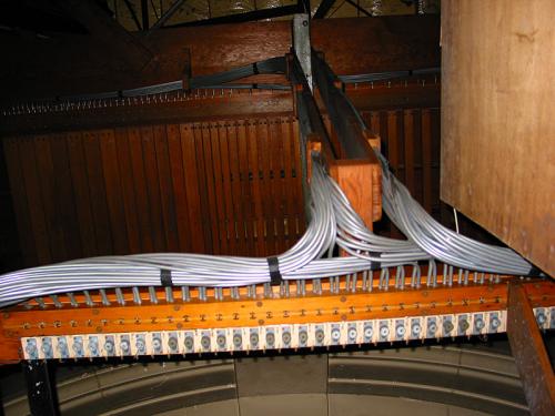 Au-dessus de chaque registre, il y a deux languettes blanches. On appelle les jeux par des poussoirs blancs placés au centre de la barre sous le premier clavier. Sur ces pistons : Jeux/I/II/ et un poussoir rouge pour annuler.