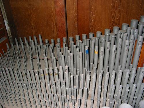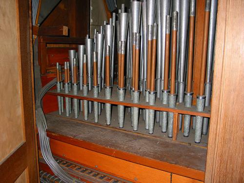 Droit et concave, le pédalier est en chêne. Les feintes sont alignées en arc de cercle et leur fronton est droit. Les touches sont soutenues à l’arrière par une lame en métal qui fait office de ressort.
