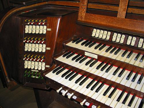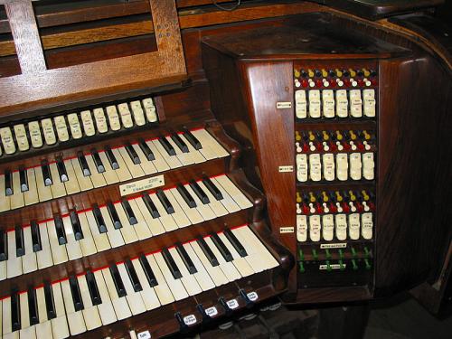 Sous le 1er clavier, il y a une série de poussoirs (blanc) indiquant Récit/Positif, Récit/Grand-Orgue, Positif Grand-Orgue, Comb. 1, Comb. 2 (rouge), Comb. 3 (jaune), Comb. 4 (noir), Annul. (languette métallique)