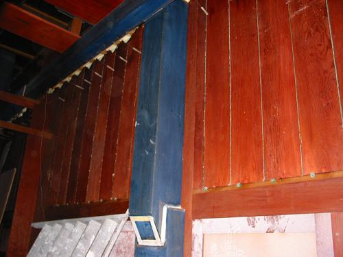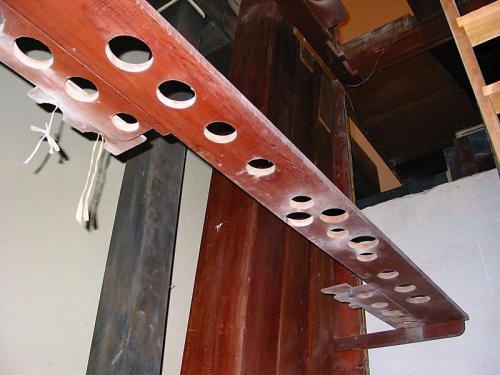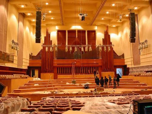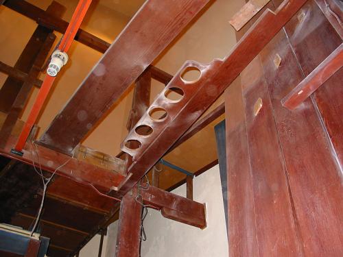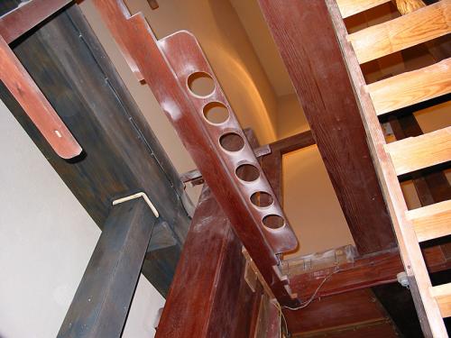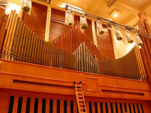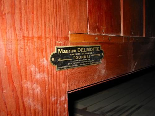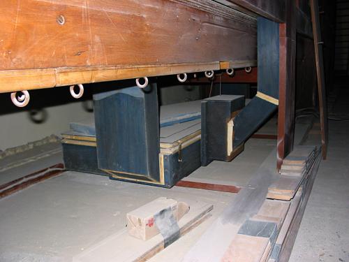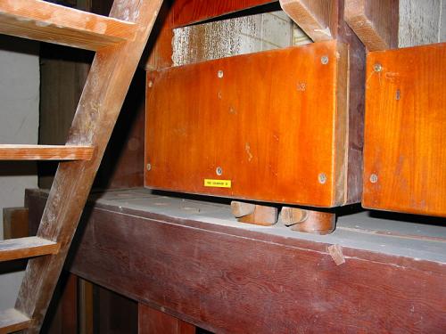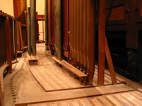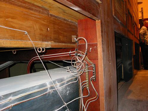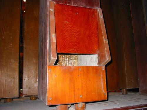 Habillage intérieur de type acajou clair avec trois faces inclinées, deux pour les registres, à gauche et à droite, et une pour les claviers eux-même surmontés de diverses bascules et boutons.