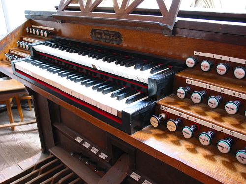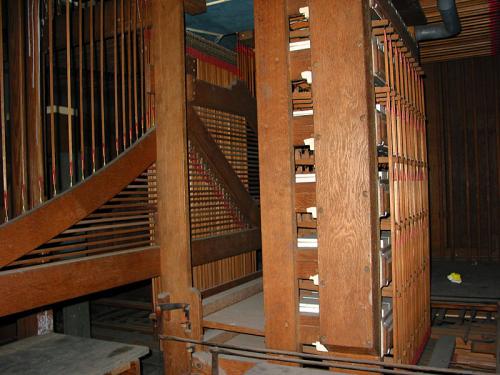 De registerknoppen zijn ronde trekkers in eik met zwart, voorzien van porseleinen plaatjes die de namen van de registers dragen met zwarte kleur voor het Hoofdwerk, rood voor het Reciet en groen voor het Pedaal