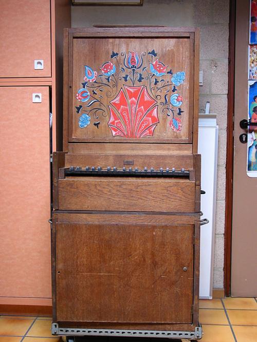 Beschrijving van de orgelkast Rechthoekig klein meubel verhoogd met twee op elkaar gestapelde delen. Vooraan beschilderde deur met rode, zwarte en witte bladeren. Het bovenste bedekt de orgelpijpen en de basis, de motor en de blaasbalg. Langs beide kanten is er een metalen handvat om het instrument te verplaatsen. Daarboven steunt alles op een metalen structuur op wieltjes.