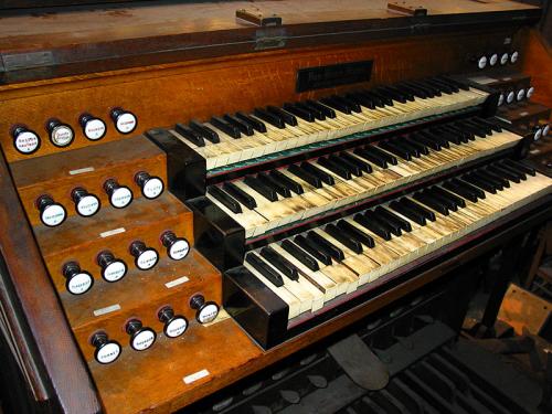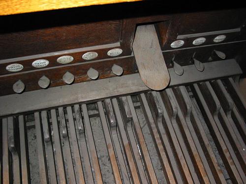CORNET V. (8’,4’,2’2/3, 2’, 1’3/5) 5 x 31 pijpen waarvan de 1ste rij met mobiele hoed, kernsteken en zijbaarden en de vier andere rijen open met kernsteken en intoneerlitsen.