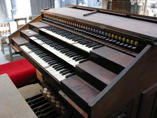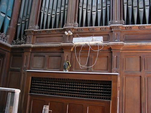 Voor de drie (ontdubbelde) tongwerkregisters zijn de punten in koper, de kernen vierkant, de mondstukken cirkelvormig en de stemkrukken van ijzer.