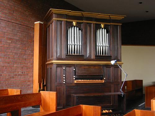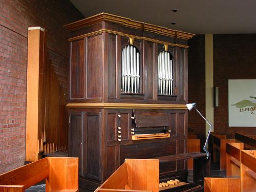 Beschrijving van de orgelkast Donker gekleurde kast met twee frontvelden, kroonlijst bovenaan en een kleine lijst tussen boven- en onderkast. Klavier aan de voorzijde, pedaal ingebouwd op een verhoog onder de oude kast.