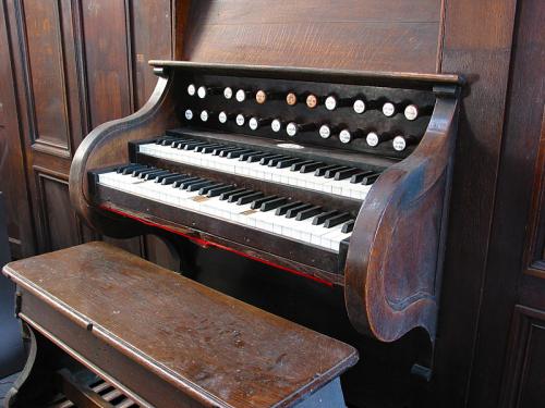 Een groot houten blok, op een veer gemonteerd, bedient de zwelkast, rechts, juist achter de voetpedaal. Voor koppel en pedaalkoppel zijn er twee inhaaktreden in hout, boven het voetpedaal.