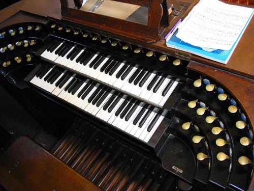 Registers in de vorm van kleine messing lepels, verspreid over de drie niveaus, aan beide zijden van de manualen.