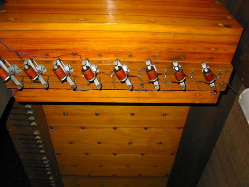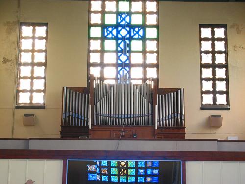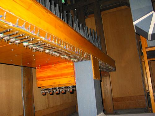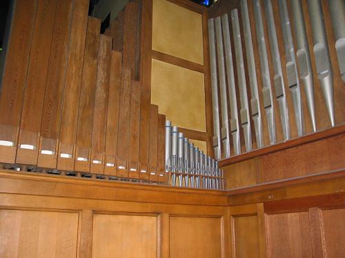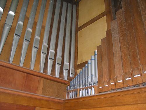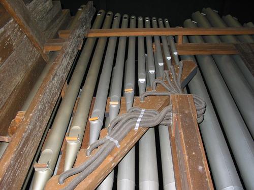 Opstelling van de pijpen Frontaal 29 pijpen van het Principaal 8’ zijn symmetrisch opgesteld, achter hen, 2 x 12 pijpen van de Salicional 8’ gaande van de zijkant naar het centrum. In de velden van elke kant, 12 pijpen van de Bourdon 16’ in pitchpin en opgesteld in diatonische orde van voor naar achter.