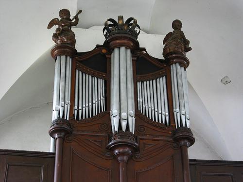 Ter hoogte van de trekkers zijn er registerplaatjes van perkamenttype, bedrukt met gedrukte letters, maar geperforeerd door het register waardoor bepaalde delen onleesbaar zijn geworden. Wie de stijlen tussen deze panelen en de console aandachtig bekijkt, ziet aan weerszijden vier dichtgestopte gaten. Dit wijst erop dat de registerplaatjes origineel zijn en dat de trekkers tijdens een latere interventie werden verplaatst.