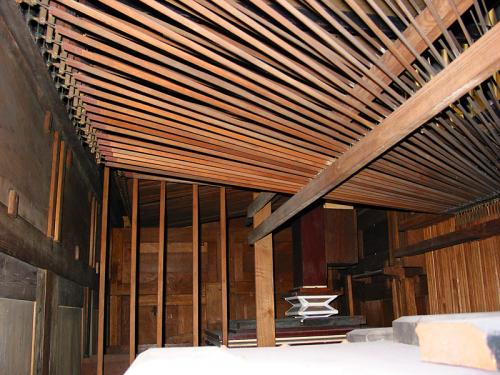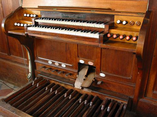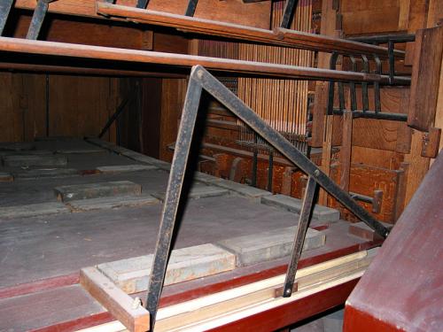 Speeltafel - bijzonderheden Ronde registertrekkers, bediening aan de voeten: koppelingen, pedaalkoppels met lepels; twee zwelkasten