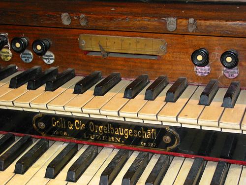 Tussen de manualen III en IV, op het zwartgekleurde plankje, bevindt zich een plaat geslepen zwart spiegelglas die achteraan met letters bedrukt is en ingelijst in goud op een zwarte ondergrond. Men kan lezen: Goll & Cie Orgelbaugeschäft 1906. Luzern. Op. 287.