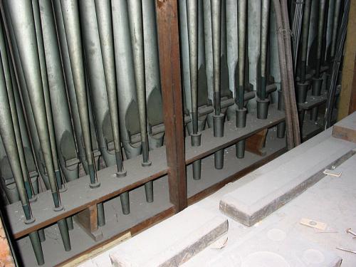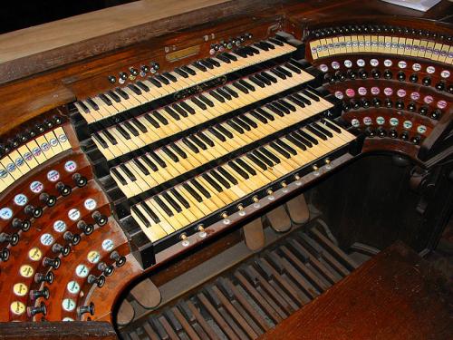 Boven manuaal IV bevinden zich op de verticale lat tien identieke, kleine registers, die geen twee porseleinen uiteinden hebben. De anderen lezen van links naar rechts:
