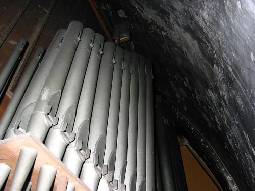 Tussen de tien kleine registers boven het manuaal IV is er een barst in het hout voorzien van een schuifknop die voor een koperen plaatje schuift waarop streepjes en cijfers van 0 tot 35 staan (algemeen crescendo).