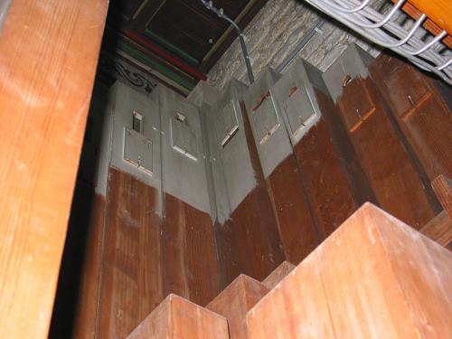 Twee schuine tafels aan weerszijden van de manualen bevatten de rangen van de registers.