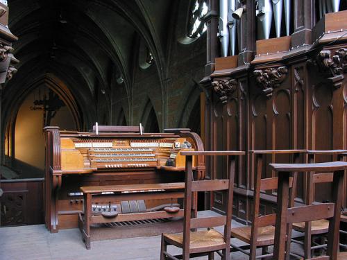 Seconde console. Intérieur en chêne laqué avec simple clavier surmonté d’une rangée horizontale de dominos à bascule pour les registres du Positif.