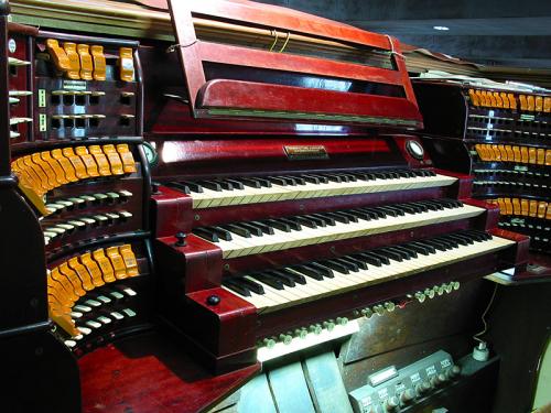 De gewone koppelingen kunnen worden bediend met zes witte drukknoppen links onder het eerste manuaal.